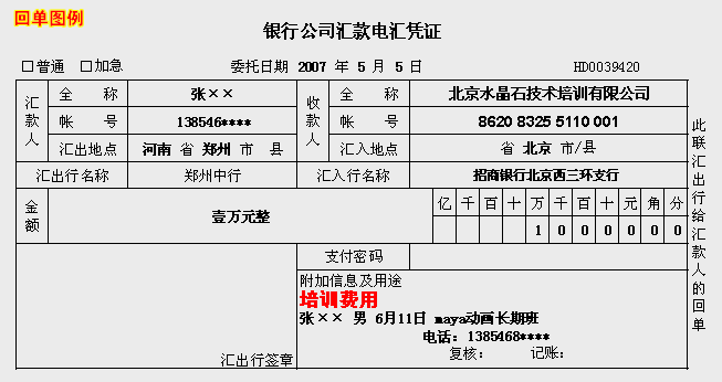 注意: 以上匯款單為參考匯款單,因每個城市的銀行匯款單的樣式不盡相同,所以我們只是用一個匯款單為案例給大家做以講解。大家只要在匯款單相應的方格內填入相應的文字即可。如果有什么不明白的,您可以咨詢一下當地的銀行工作人員。 |