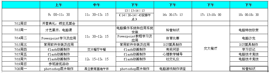 教學環境:營地定于昂立教育基地本部,明亮的畫室以及專業的多媒體機房,供學生學習