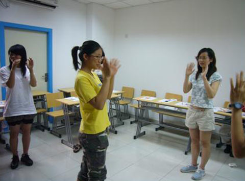 語言的學習是一個痛苦和枯燥的過程,單詞是語言的基礎,背單詞又需要從音、形、意三者結合入手,如何才能輕松記憶呢?根據單詞的意思,通過做游戲,結合對聲音、動作、眼神、臺詞的訓練, 配合肢體語言來表達,比如:Merci“謝謝”是雙手拱起道謝,Oui / Non“是/否”用點頭和搖頭表示,Je m’appelle...“我叫...”一只手向攤開作自我介紹,Très bien.“很好”則是翹起大拇指…這樣,在互動的學習中,即使是生硬拗口的單詞,也變得不再難記了。