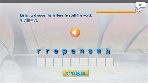 一看到那么多字母需要排序,小朋友們是不是有點慌張了呢?這會是哪個單詞呢?我們再仔細觀察發現,字母上面還有個小喇叭,原來這是一道聽力題目呢。所以,小朋友們要先點上面的黃色小喇叭,仔細聽一聽到底是哪個單詞。我們聽到了sharpener這個單詞,仔細回想一下這,個單詞是我們上課剛學過的,可是該怎么拼寫這個單詞呢?小朋友們不要著急哦,我們已經學過了自然拼讀,我們不妨多聽幾遍小喇叭,聽清楚單詞的發音,再根據發音規則把對應的字母選入方格中就可以了哦。