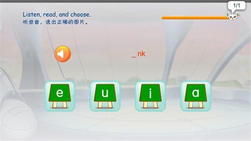小朋友似乎聽到了短e的聲音/e/,于是順手選了第一個,啊哦,掉到陷阱里啦!其實這個字母跟短e的發音非常像,但是仔細聽聽會發現區別,它的發音嘴型和舌頭的位置跟e不一樣哦!我們在1A第9課講過這個單詞:ink墨水,還記得嗎?因此,這題的正確答案是第三個:i,你選對了嗎?