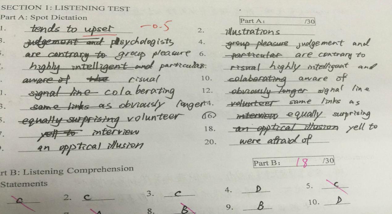 相比正式考試,?茧y度要更高,正式考試分數有15-20分的上浮空間!上?谧g培訓】但是其中老師閱卷時體現的一些問題可以給大家正式考試時敲個警鐘。下面為大家分享兩個主觀題(聽力SD和聽譯以及翻譯)部分中所發現的錯誤,希望正式考試時可以盡量避免。