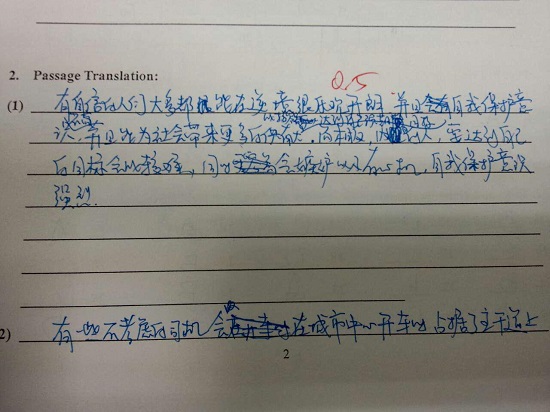 1. 語法問題。老生常談的問題,也是扣分最為厲害的部分(當然英譯漢不涉及語法問題),主要還是發生在漢譯英的時候,在此列舉些閱卷過程中學生所犯的典型錯誤。1) 前后時態不一致,There was a time when people love… 2) 動詞用法不到位,如:should to do/have grew等嚴重的錯誤。3) 前后不對等。如:Be more brave and more confidence,這里的brave是形容詞,confidence是名詞,顯然不對等。4)hard與hardly問題,有同學用It is hardly for them to…