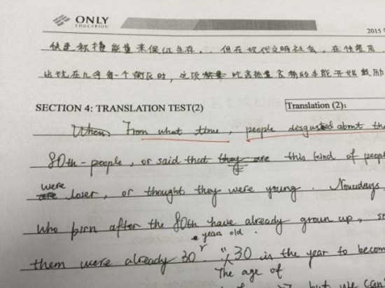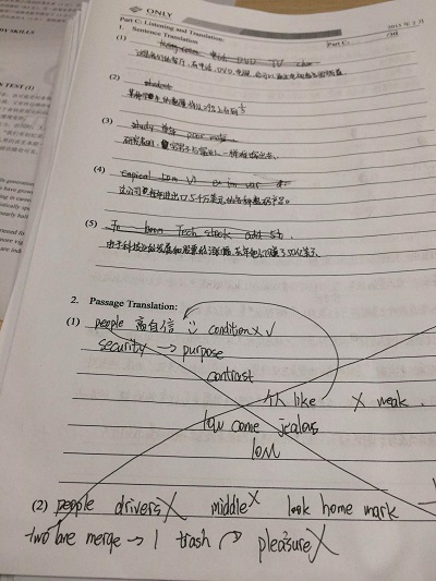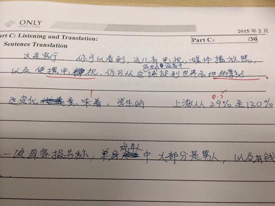 5. 最后,聽譯部分畢竟題型難度較大,總是會有生詞或是關鍵信息沒有及時抓住。這個時候同學應該根據已聽懂的部分,經過上下文推敲,自圓其說,千萬不能在答題紙上留下空白,給批卷老師做填空題。 答題的原則應是:寫在答題紙上的句子或段落一定是完整通順的