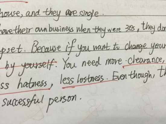 3. 單詞拼寫問題:interviewer拼成了interviee,complaint拼成了complainment,lost拼寫成了lostness,最基本的單詞拼寫各位同學平時還是需要不斷加強與鞏固,避免在考試中犯如此低級的錯誤。