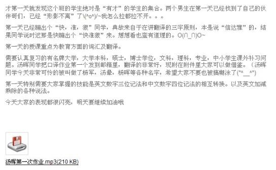 3. 口頭作業請每位同學用手機或者是MP3將自己口語的音頻錄下來然后用電子郵件發到公共郵箱lovemichelle0809@126.com里面。上交的文件名請寫好格式名字+第幾次作業。
