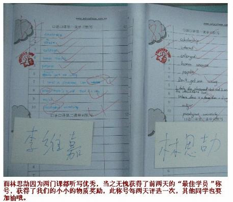 首先在第一次課的時候發一張給家長的課程說明,讓家長明白我們每天的動作,如聽寫和作業等,還會定期公布優秀學員并放在主頁上,最終獲得整個學期優秀學員的同學可獲得課程獎勵。具體操作如下: