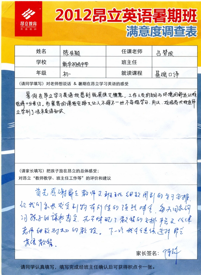 昂立教育 > 項目總攬 > 基礎口譯 > 學習體會 > 2012昂立英語暑假班滿意度反饋表-陳佳穎