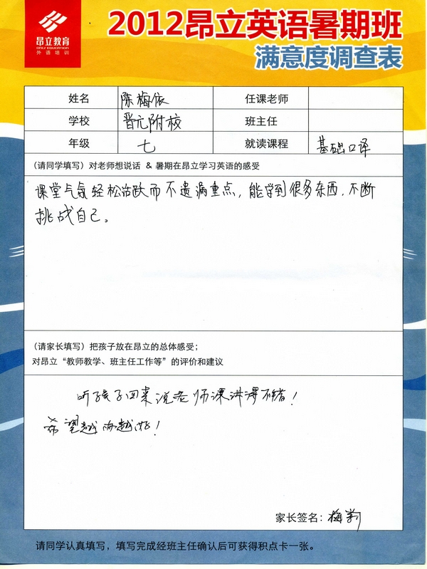 昂立教育 > 項目總攬 > 基礎口譯 > 學習體會 > 2012昂立英語暑假班滿意度反饋表-陳梅依