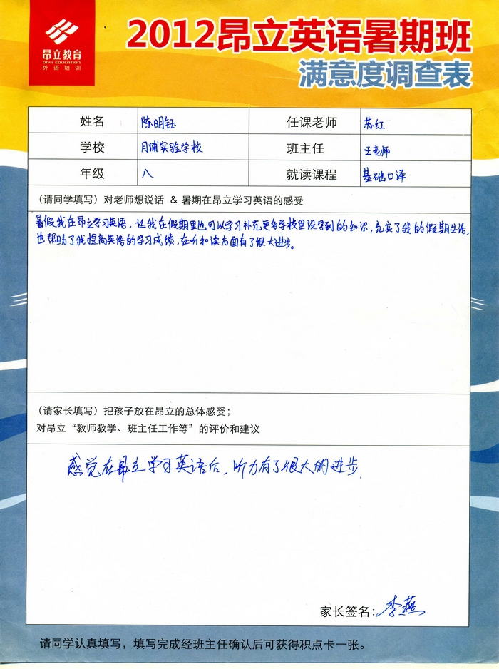 昂立教育 > 項目總攬 > 基礎口譯 > 學習體會 > 2012昂立英語暑假班滿意度反饋表-陳明鈺