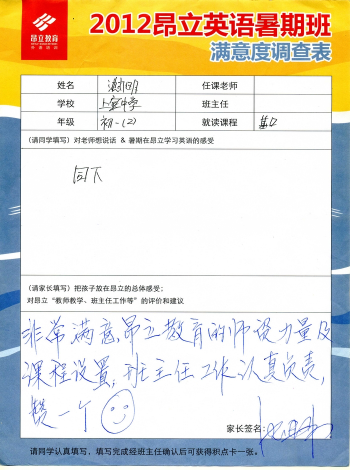昂立教育 > 項目總攬 > 基礎口譯 > 學習體會 > 2012昂立英語暑假班滿意度反饋表-池亦明