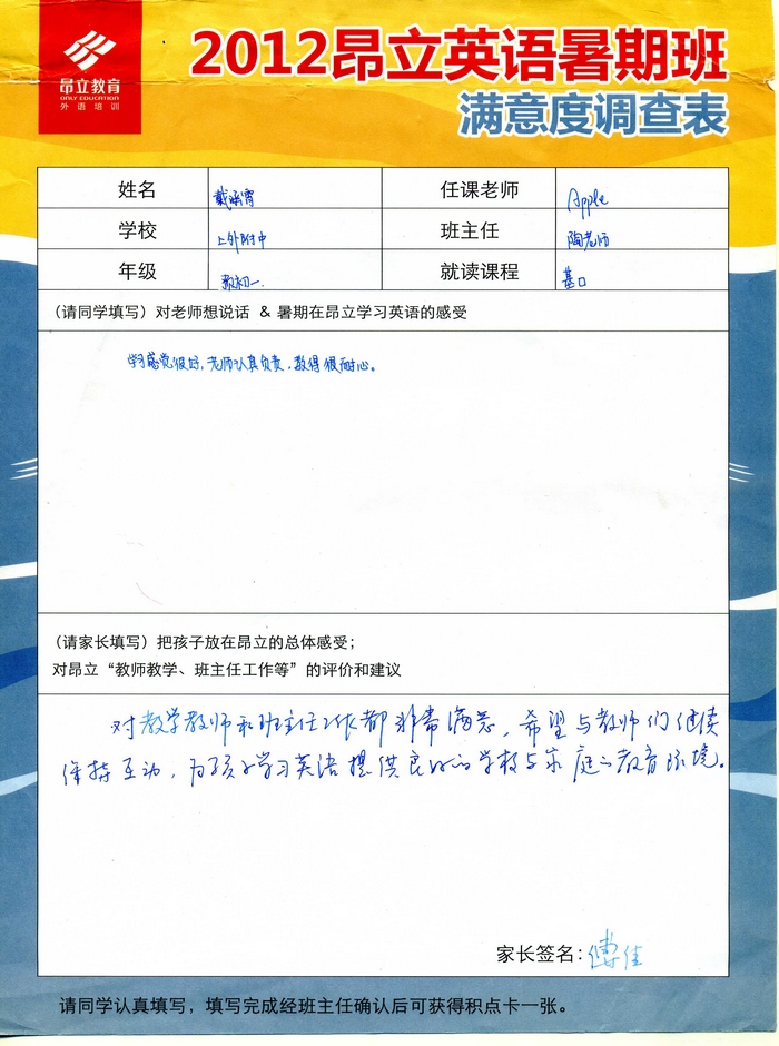 2012昂立英語暑假班滿意度反饋表-戴涵霄