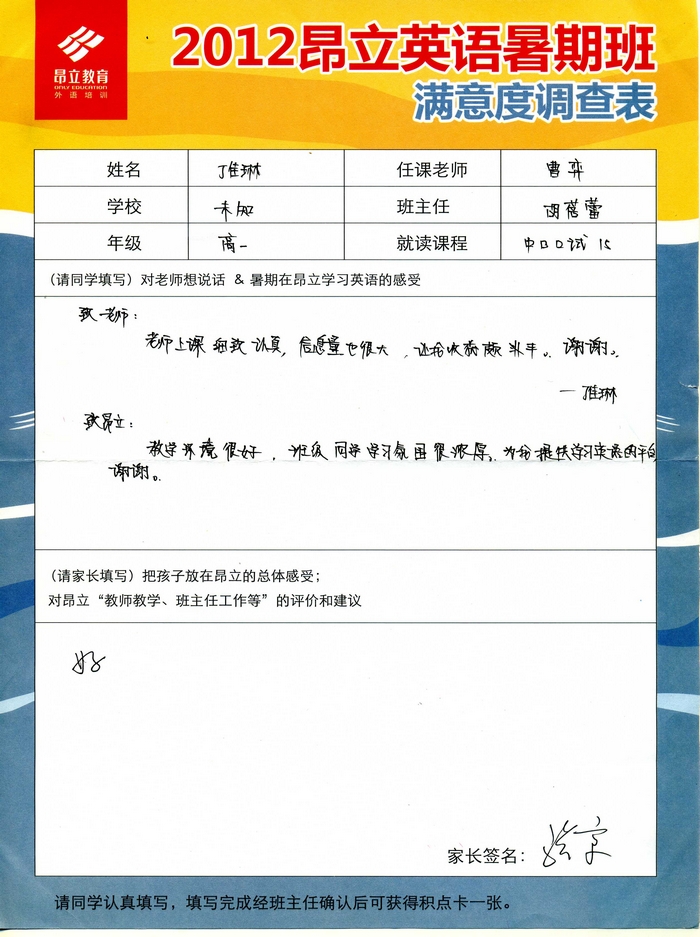 昂立教育 > 項目總攬 > 基礎口譯 > 學習體會 > 2012昂立英語暑假班滿意度反饋表-丁佳琳