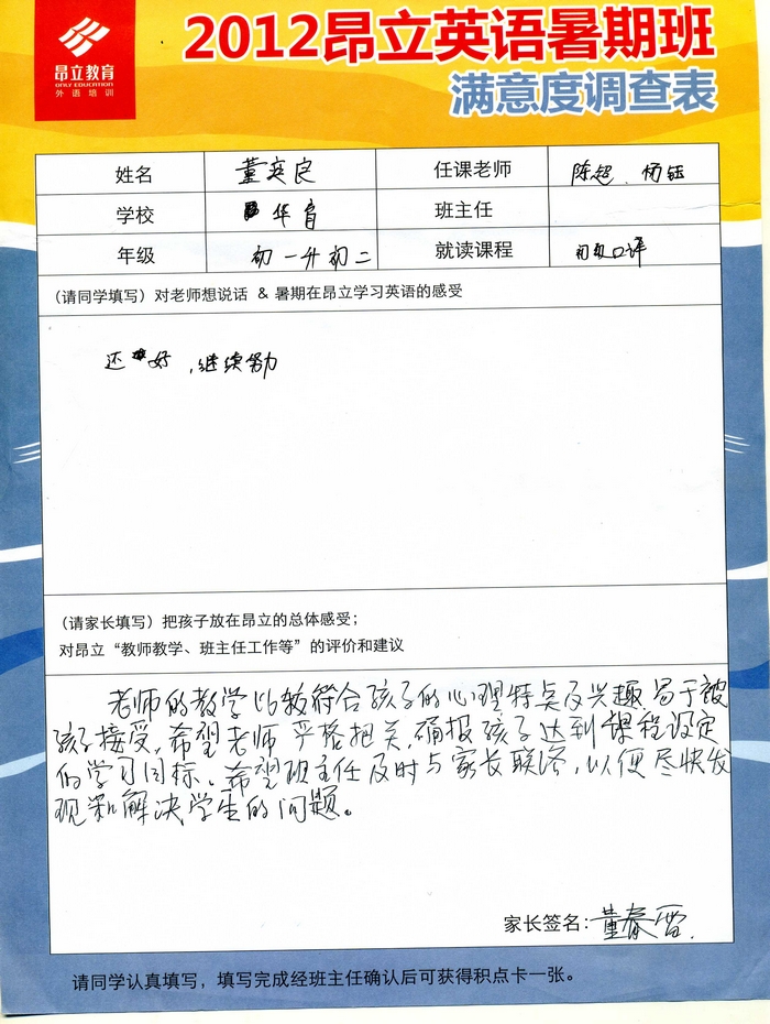 昂立教育 > 項目總攬 > 基礎口譯 > 學習體會 > 2012昂立英語暑假班滿意度反饋表-董奕良