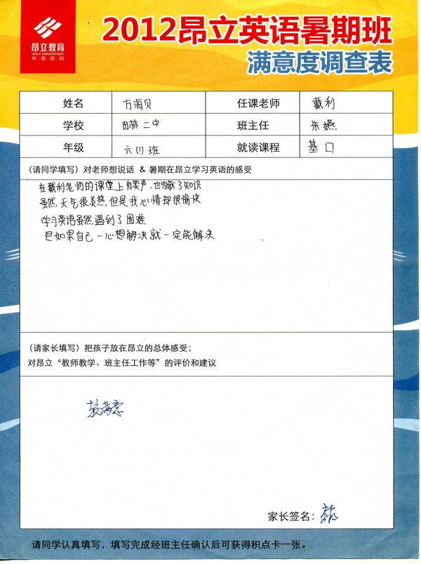 昂立教育 > 項目總攬 > 基礎口譯 > 學習體會 > 2012昂立英語暑假班滿意度反饋表-方海貝