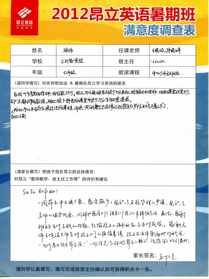 昂立教育 > 項目總攬 > 基礎口譯 > 學習體會 > 2012昂立英語暑假班滿意度反饋表-顧瑋