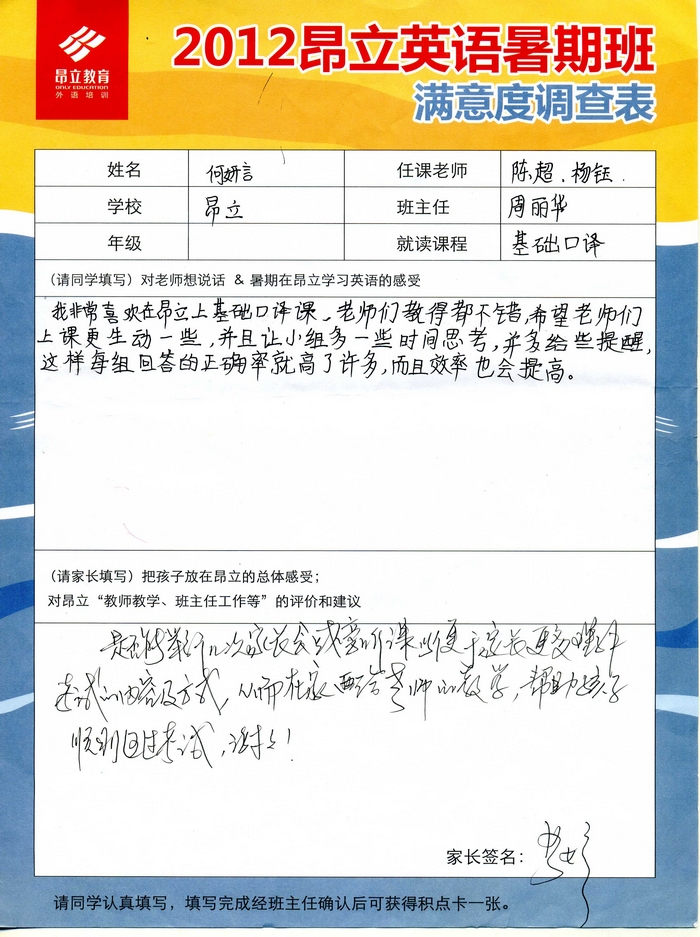 2012昂立英語暑假班滿意度反饋表-何妍言