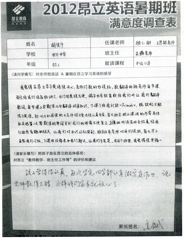 昂立教育 > 項目總攬 > 基礎口譯 > 學習體會 > 2012昂立英語暑假班滿意度反饋表-胡佳寧