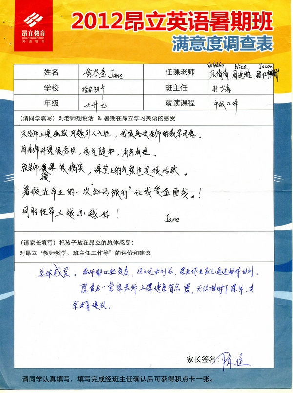 昂立教育 > 項目總攬 > 基礎口譯 > 學習體會 > 2012昂立英語暑假班滿意度反饋表-黃岑瑩
