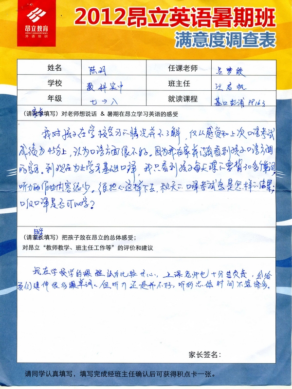 昂立教育 > 項目總攬 > 基礎口譯 > 學習體會 > 2012昂立英語暑假班滿意度反饋表-陳玥