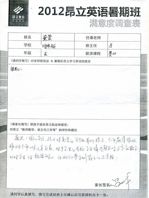 昂立教育 > 項目總攬 > 基礎口譯 > 學習體會 > 2012昂立英語暑假班滿意度反饋表-董萱