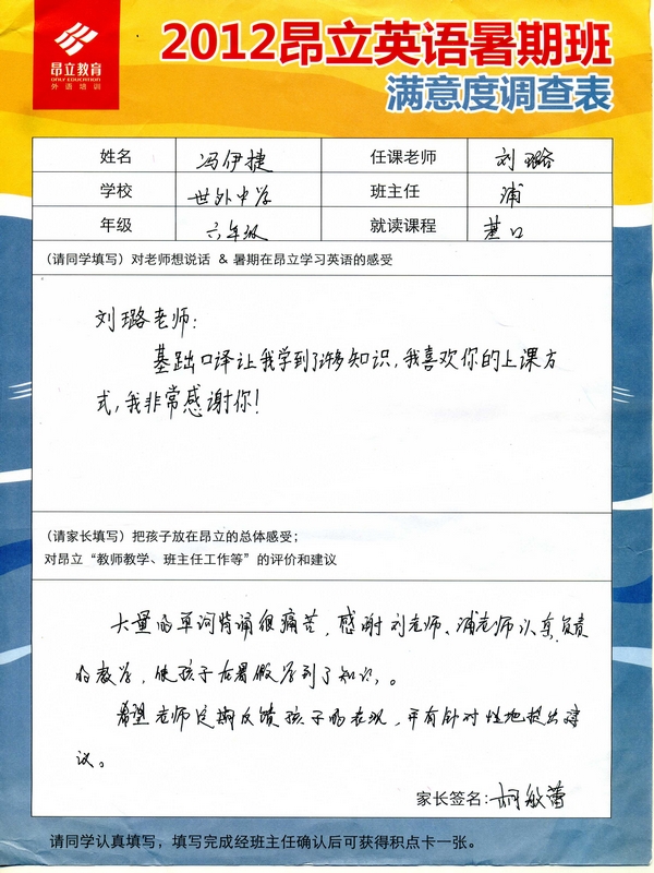 昂立教育 > 項目總攬 > 基礎口譯 > 學習體會 > 2012昂立英語暑假班滿意度反饋表-馮伊捷