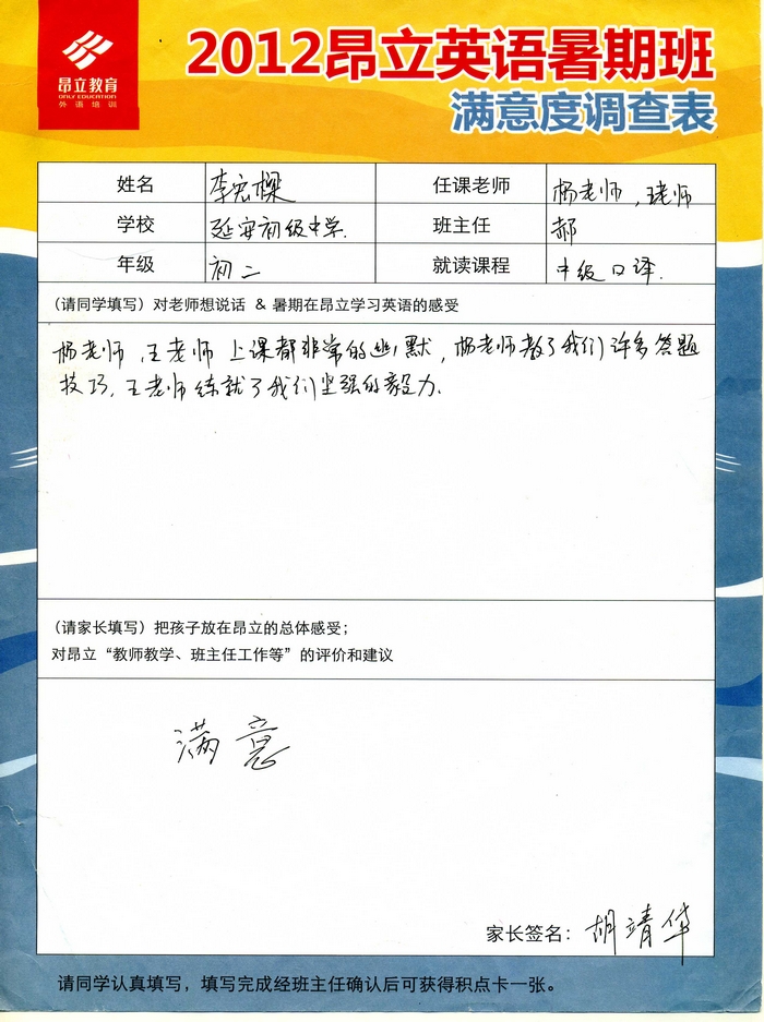 昂立教育 > 項目總攬 > 基礎口譯 > 學習體會 > 2012昂立英語暑假班滿意度反饋表-李宏墚