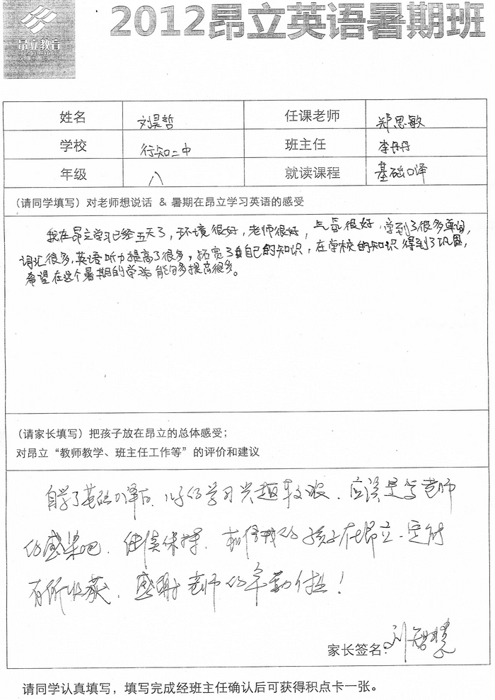 昂立教育 > 項目總攬 > 基礎口譯 > 學習體會 > 2012昂立英語暑假班滿意度反饋表-劉昊哲