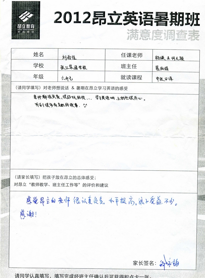 昂立教育 > 項目總攬 > 基礎口譯 > 學習體會 > 2012昂立英語暑假班滿意度反饋表-劉雨佳