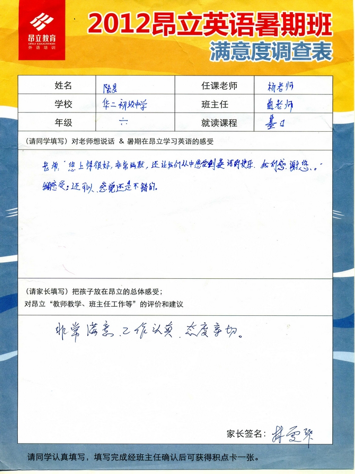 昂立教育 > 項目總攬 > 基礎口譯 > 學習體會 > 2012昂立英語暑假班滿意度反饋表-陸旻
