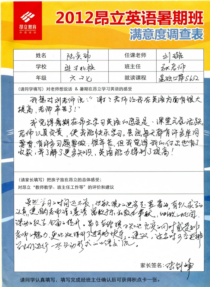 昂立教育 > 項目總攬 > 基礎口譯 > 學習體會 > 2012昂立英語暑假班滿意度反饋表-陸奕瑋