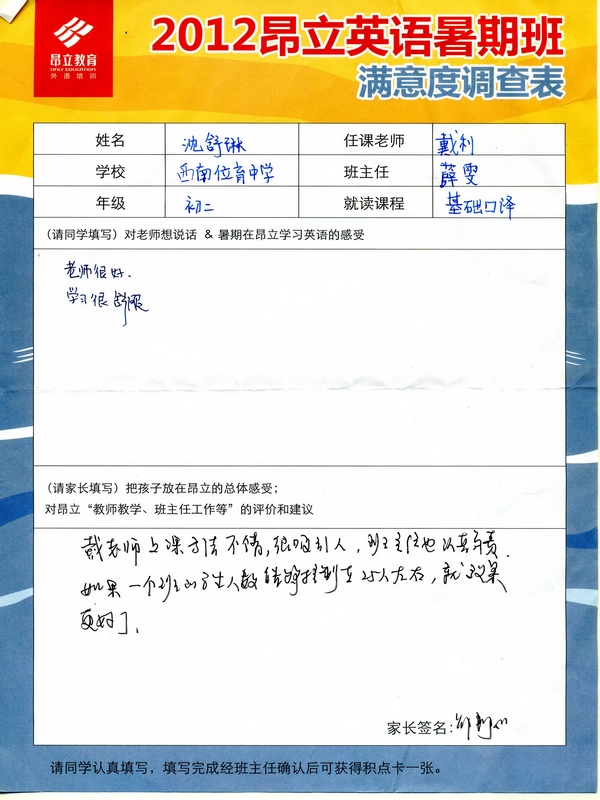 2012昂立英語暑假班滿意度反饋表-沈舒琳