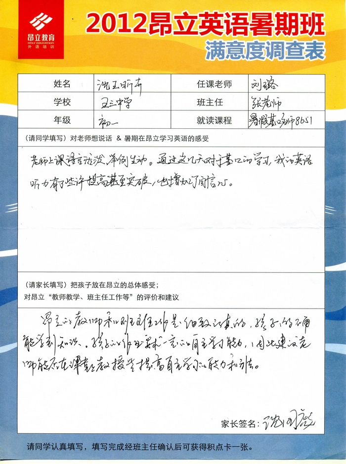 昂立教育 > 項目總攬 > 基礎口譯 > 學習體會 > 2012昂立英語暑假班滿意度反饋表-沈王昕卉