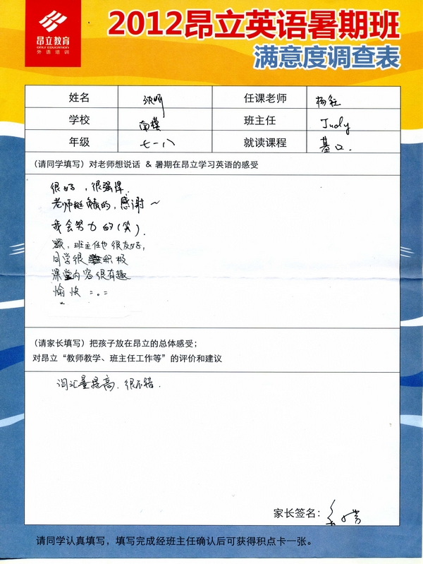 2012昂立英語暑假班滿意度反饋表-沈昕