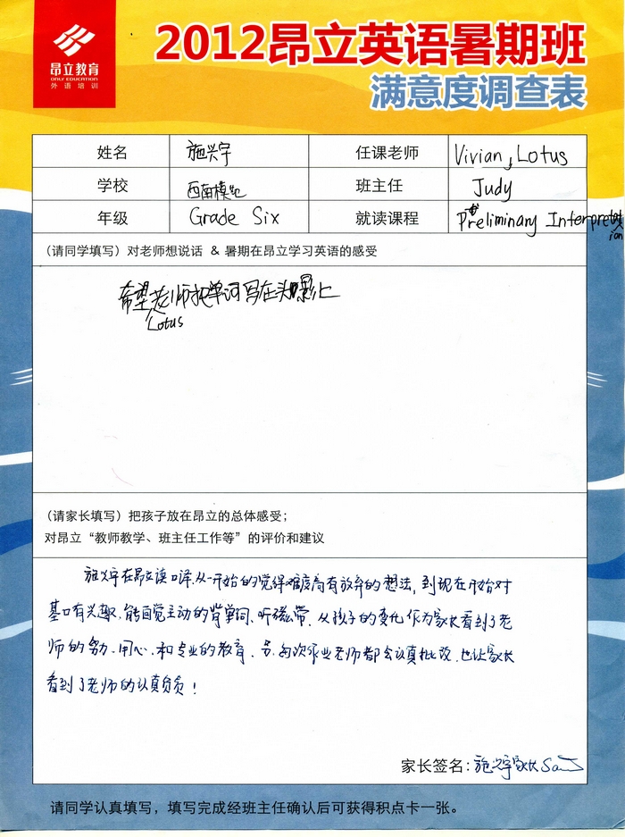 昂立教育 > 項目總攬 > 基礎口譯 > 學習體會 > 2012昂立英語暑假班滿意度反饋表-施興宇