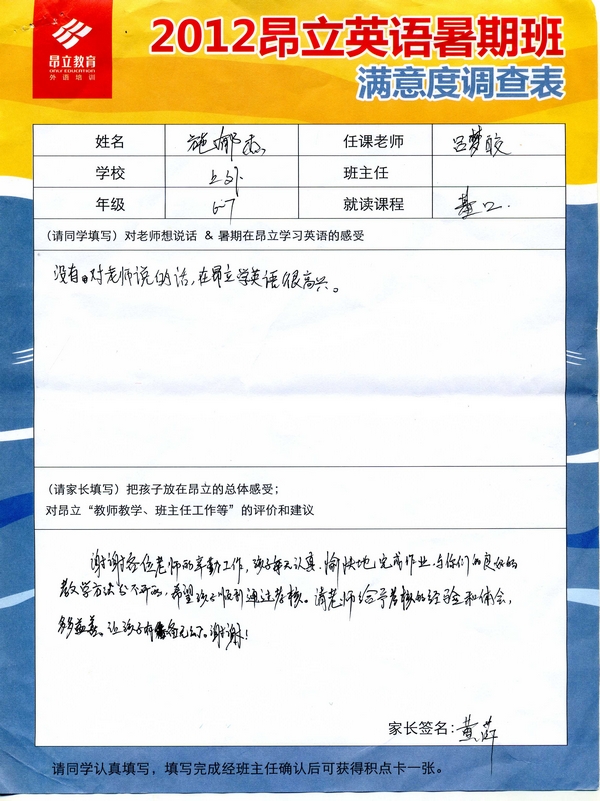 昂立教育 > 項目總攬 > 基礎口譯 > 學習體會 > 2012昂立英語暑假班滿意度反饋表-施郁杰