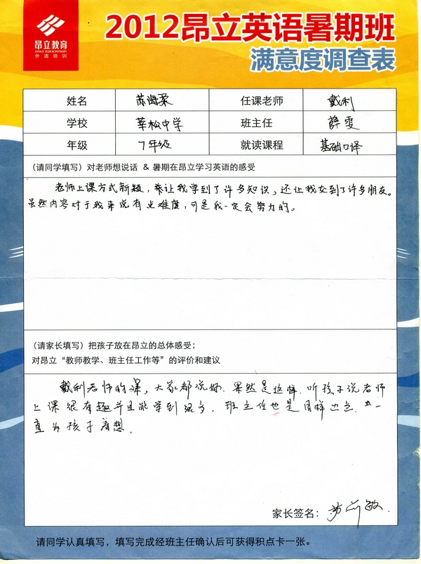 昂立教育 > 項目總攬 > 基礎口譯 > 學習體會 > 2012昂立英語暑假班滿意度反饋表-蘇海柔