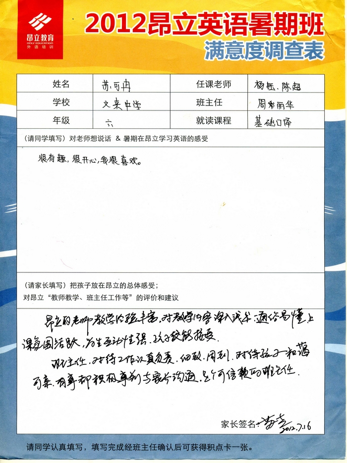 昂立教育 > 項目總攬 > 基礎口譯 > 學習體會 > 2012昂立英語暑假班滿意度反饋表-蘇可冉