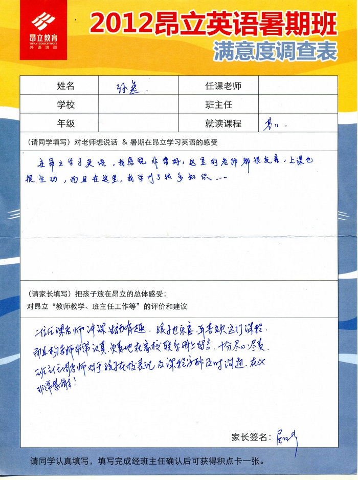 昂立教育 > 項目總攬 > 基礎口譯 > 學習體會 > 2012昂立英語暑假班滿意度反饋表-孫逸