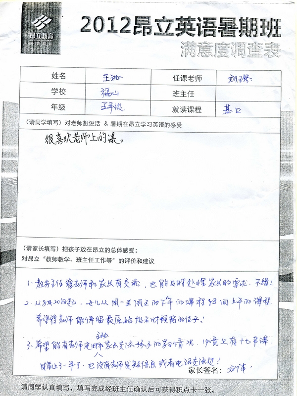 昂立教育 > 項目總攬 > 基礎口譯 > 學習體會 > 2012昂立英語暑假班滿意度反饋表-王沁