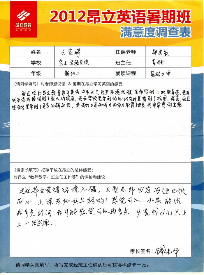 昂立教育 > 項目總攬 > 基礎口譯 > 學習體會 > 2012昂立英語暑假班滿意度反饋表-王宣婷