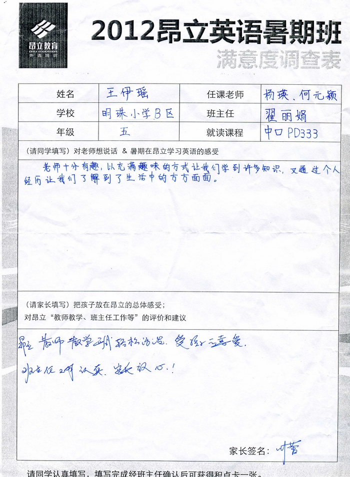 昂立教育 > 項目總攬 > 基礎口譯 > 學習體會 > 2012昂立英語暑假班滿意度反饋表-王伊瑤