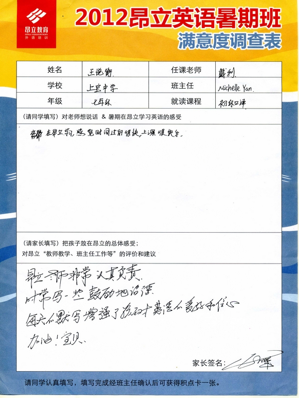 2012昂立英語暑假班滿意度反饋表-王悅衡