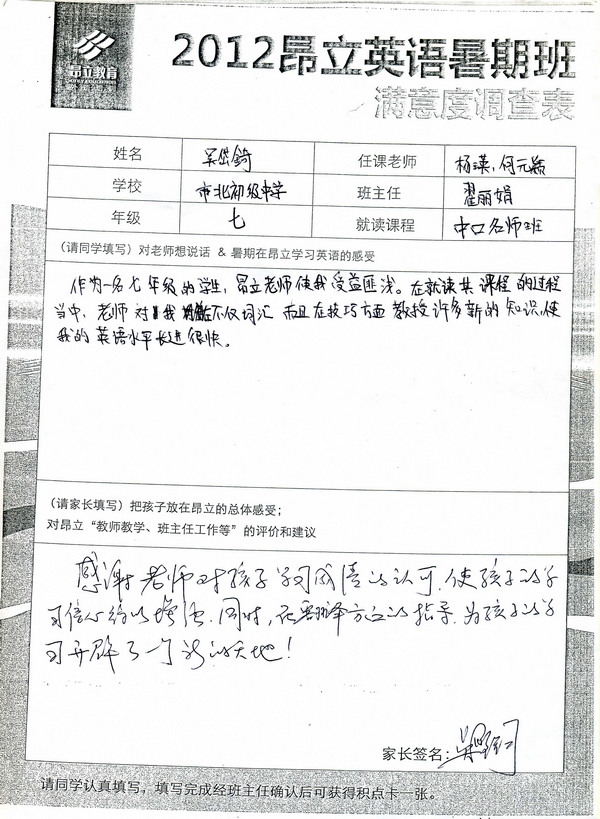 昂立教育 > 項目總攬 > 基礎口譯 > 學習體會 > 2012昂立英語暑假班滿意度反饋表-吳岱琦