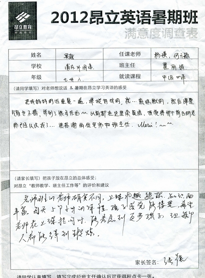 昂立教育 > 項目總攬 > 基礎口譯 > 學習體會 > 2012昂立英語暑假班滿意度反饋表-吳越