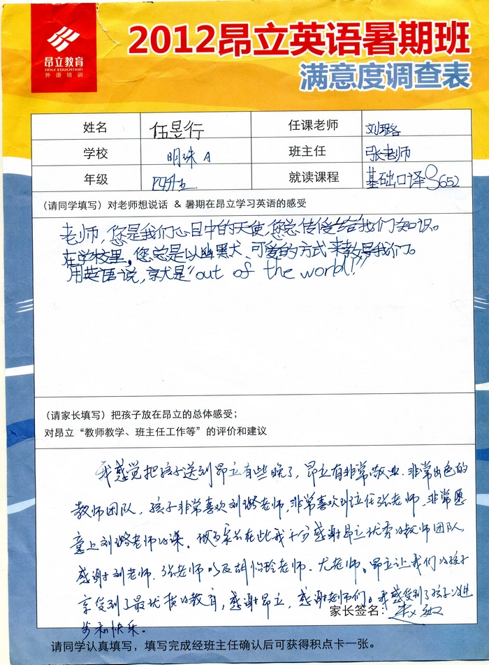 昂立教育 > 項目總攬 > 基礎口譯 > 學習體會 > 2012昂立英語暑假班滿意度反饋表-伍昱行