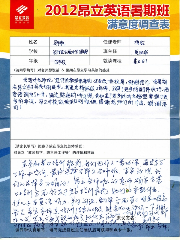 昂立教育 > 項目總攬 > 基礎口譯 > 學習體會 > 2012昂立英語暑假班滿意度反饋表-夏舟航