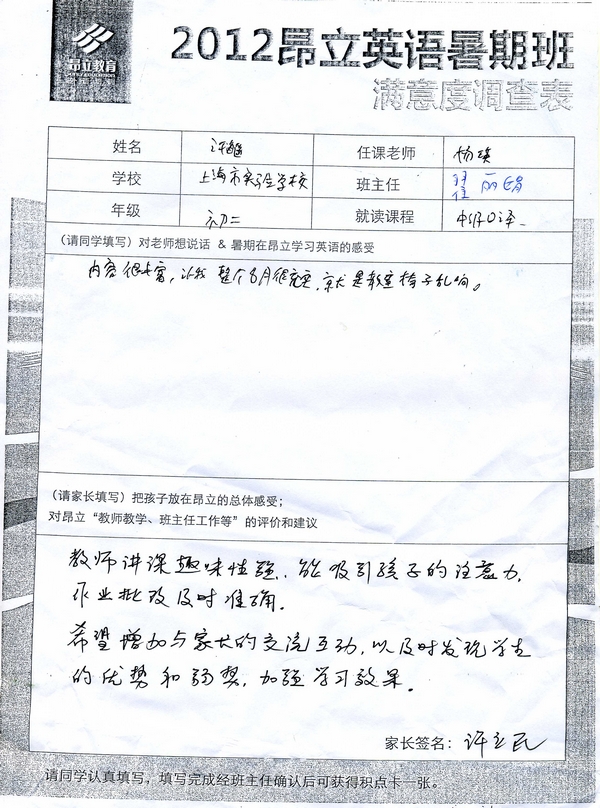 昂立教育 > 項目總攬 > 基礎口譯 > 學習體會 > 2012昂立英語暑假班滿意度反饋表-許海遙