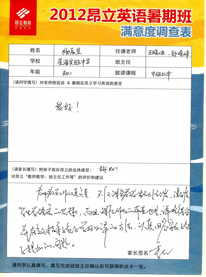 昂立教育 > 項目總攬 > 基礎口譯 > 學習體會 > 2012昂立英語暑假班滿意度反饋表-楊辰旻