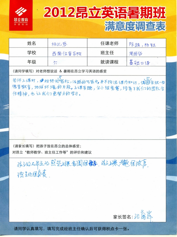 昂立教育 > 項目總攬 > 基礎口譯 > 學習體會 > 2012昂立英語暑假班滿意度反饋表-楊孔慈